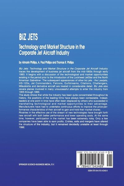 Biz Jets: Technology and Market Structure in the Corporate Jet Aircraft Industry traces the development of business jet aircraft from the mid-1950s through early 1993. It begins with a discussion of the technological and market opportunities existing in the period prior to the introduction of the Lockheed JetStar and the North American Sabreliner. The subsequent appearances of other biz jets -- the Learjets, HS-125s, Jet Commanders, Falcons, Gulfstreams, Citations, Challengers, Mitsubishis and derivative aircraft are treated in considerable detail. Biz Jets also covers 'planes involved in many unsuccessful attempts to enter the industry from 1955 through 1993.