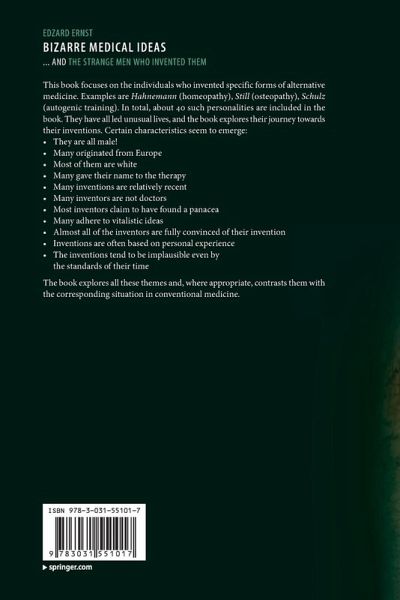 This book focuses on the individuals who invented specific forms of alternative medicine. Examples are Hahnemann (homeopathy), Still (osteopathy), Schulz (autogenic training). In total, about 40 such personalities are included in the book. They have all led unusual lives, and the book explores their journey towards their inventions. Certain characteristics seem to emerge: