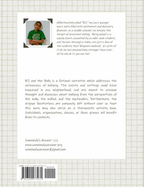 BJ and the Bully is a fictional narrative which addresses the seriousness of bullying. The events and settings could have happened in any neighborhood, and are meant to provoke thought and discussion about bullying from the perspectives of the bully, the bullied, and the bystanders. Furthermore, the original illustrations are purposely left without color so that this work may also serve as a therapeutic activity book. Individuals, organizations, classes, or focus groups will benefit from its contents.
