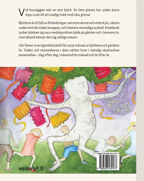 Over the years, a little sapling has grown into a big birch tree, standing right next to a family's house. It has a sturdy trunk and branches full of leaves. For the birch, the year is full of changes: the warmth of summer; the wistful farewells of autumn; the chill of winter; and the miracle of growth in spring. The birch is often the center of life for the children playing in the yard, but sometimes the birch is left all alone. In this book, each month depicts a vignette in the life of the birch and its surroundings. The tree and the family are in an ongoing, delicate interaction—from one day, one month, and one year, to another. --- Vid husväggen står en stor björk. En liten planta har under årens lopp vuxit till ett stadigt träd med täta grenar. Björkens år är fyllt av förändringar: sommarvärme och vinterkyla, vårens underverk då trädet knoppas, och höstens vemodiga avsked. Emellanåt tycker björken sig vara medelpunkten både på gården och i barnens liv, men ibland känner den sig väldigt ensam. Här finner vi en ögonblicksbild för varje månad ur björkens och gårdens liv. Trädet och människorna i dess närhet lever i ständig växelverkan sinsemellan– dag efter dag, månad efter månad och år efter år.