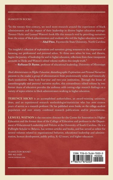 Black Administrators in Higher Education: Autoethnographic Explorations and Personal Narratives offers uniquely designed chapters grouped in theory. This volume explores such topics as shared and servant leadership, self-efficacy mechanism, educational leadership, resiliency and achievements among administrators.