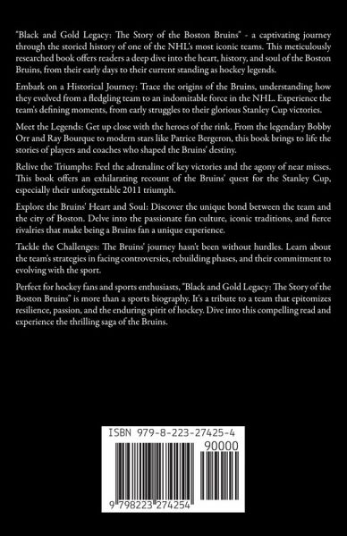 "Black and Gold Legacy: The Story of the Boston Bruins" - a captivating journey through the storied history of one of the NHL's most iconic teams. This meticulously researched book offers readers a deep dive into the heart, history, and soul of the Boston Bruins, from their early days to their current standing as hockey legends. Embark on a Historical Journey: Trace the origins of the Bruins, understanding how they evolved from a fledgling team to an indomitable force in the NHL. Experience the team's defining moments, from early struggles to their glorious Stanley Cup victories. Meet the Legends: Get up close with the heroes of the rink. From the legendary Bobby Orr and Ray Bourque to modern stars like Patrice Bergeron, this book brings to life the stories of players and coaches who shaped the Bruins' destiny. Relive the Triumphs: Feel the adrenaline of key victories and the agony of near misses. This book offers an exhilarating recount of the Bruins' quest for the Stanley Cup, especially their unforgettable 2011 triumph. Explore the Bruins' Heart and Soul: Discover the unique bond between the team and the city of Boston. Delve into the passionate fan culture, iconic traditions, and fierce rivalries that make being a Bruins fan a unique experience. Tackle the Challenges: The Bruins' journey hasn't been without hurdles. Learn about the team's strategies in facing controversies, rebuilding phases, and their commitment to evolving with the sport. Perfect for hockey fans and sports enthusiasts, "Black and Gold Legacy: The Story of the Boston Bruins" is more than a sports biography. It's a tribute to a team that epitomizes resilience, passion, and the enduring spirit of hockey. Dive into this compelling read and experience the thrilling saga of the Bruins.