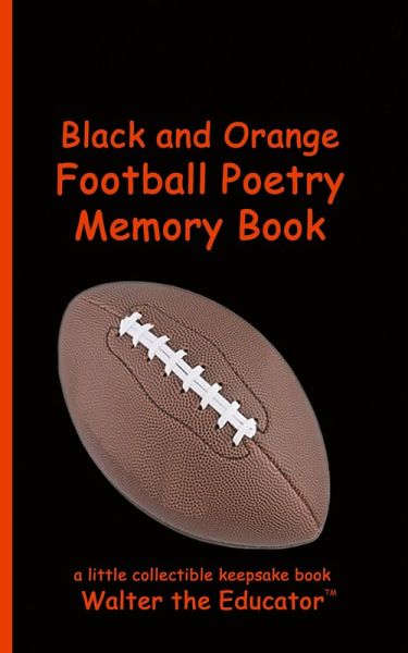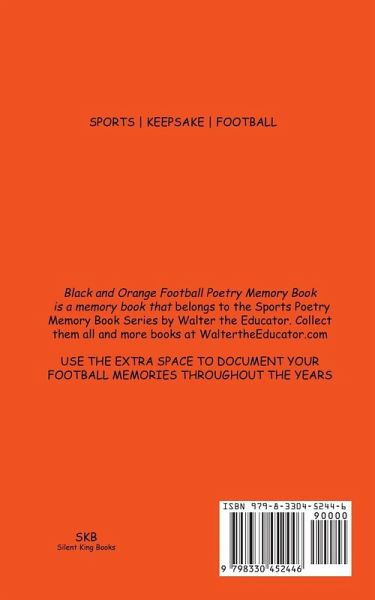 Black and Orange Football Poetry Memory Book is a memory book that belongs to the Sports Poetry Memory Book Series by Walter the Educator. Collect them all and more books at WaltertheEducator.com. USE THE EXTRA SPACE TO DOCUMENT YOUR FOOTBALL MEMORIES THROUGHOUT THE YEARS