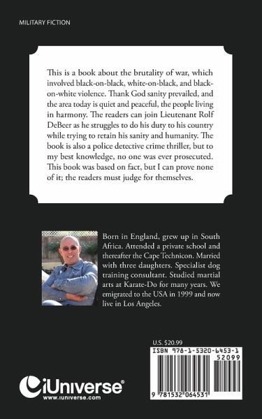 This is a book about the brutality of war, which involved black-on-black, white-on-black, and black-on-white violence. Thank God sanity prevailed, and the area today is quiet and peaceful, the people living in harmony. The readers can join Lieutenant Rolf DeBeer as he struggles to do his duty to his country while trying to retain his sanity and humanity. The book is also a police detective crime thriller, but to my best knowledge, no one was ever prosecuted. This book was based on fact, but I can prove none of it; the readers must judge for themselves.
