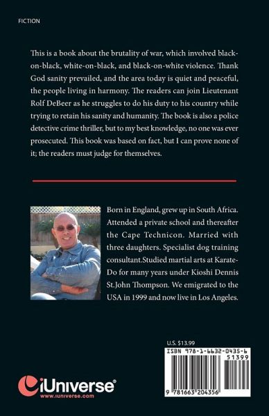 This is a book about the brutality of war, which involved black-on-black, white-on-black, and black-on-white violence. Thank God sanity prevailed, and the area today is quiet and peaceful, the people living in harmony. The readers can join Lieutenant Rolf DeBeer as he struggles to do his duty to his country while trying to retain his sanity and humanity. The book is also a police detective crime thriller, but to my best knowledge, no one was ever prosecuted. This book was based on fact, but I can prove none of it; the readers must judge for themselves.