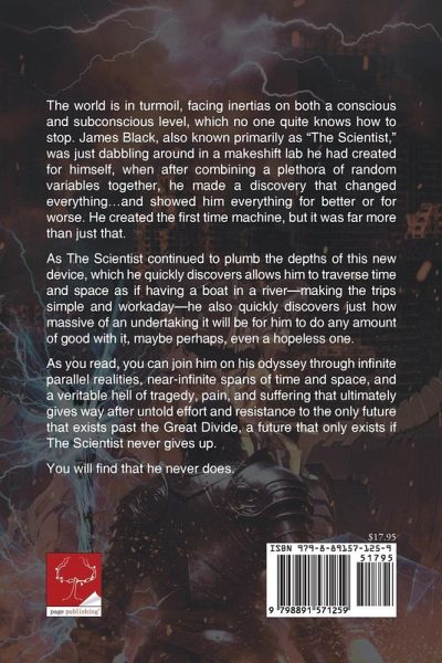 The world is in turmoil, facing inertias on both a conscious and subconscious level, which no one quite knows how to stop. James Black, also known primarily as "The Scientist," was just dabbling around in a makeshift lab he had created for himself, when after combining a plethora of random variables together, he made a discovery that changed everything...and showed him everything for better or for worse. He created the first time machine, but it was far more than just that. As The Scientist continued to plumb the depths of this new device, which he quickly discovers allows him to traverse time and space as if having a boat in a river--making the trips simple and workaday--he also quickly discovers just how massive of an undertaking it will be for him to do any amount of good with it, maybe perhaps, even a hopeless one. As you read, you can join him on his odyssey through infinite parallel realities, near-infinite spans of time and space, and a veritable hell of tragedy, pain, and suffering that ultimately gives way after untold effort and resistance to the only future that exists past the Great Divide, a future that only exists if The Scientist never gives up. You will find that he never does.