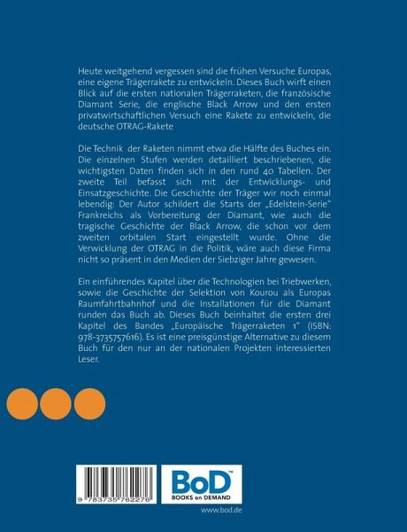 Heute weitgehend vergessen sind die frühen Versuche Europas, eine eigene Trägerrakete zu entwickeln. Dieses Buch wirft einen Blick auf die ersten nationalen Trägerraketen, die französische Diamant Serie, die englische Black Arrow und den ersten privatwirtschaftlichen Versuch eine Rakete zu entwickeln, die deutsche OTRAG-RaketeDie Technik der Raketen nimmt etwa die Hälfte des Buches ein. Die einzelnen Stufen werden detailliert beschriebenen, die wichtigsten Daten finden sich in den rund 40 Tabellen. Der zweite Teil befasst sich mit der Entwicklungs- und Einsatzgeschichte. Die Geschichte der Träger wird noch einmal lebendig: Der Autor schildert die Starts der "Edelstein-Serie" Frankreichs als Vorbereitung der Diamant, wie auch die tragische Geschichte der Black Arrow, die schon vor dem zweiten orbitalen Start eingestellt wurde. Ohne die Verwicklung der OTRAG in die Politik, wäre auch diese Firma nicht so präsent in den Medien der Siebziger Jahre gewesen.Ein einführendes Kapitel über die Technologien bei Triebwerken, sowie die Geschichte der Selektion von Kourou als Europas Raumfahrtbahnhof und die Installationen für die Diamant runden das Buch ab.Dieses Buch beinhaltet die ersten drei Kapitel des Bandes "Europäische Trägerraketen 1" (ISBN: 978-3735757616). Es ist eine preisgünstige Alternative zu diesem Buch für den nur an der nationalen Projekten interessierten Leser.