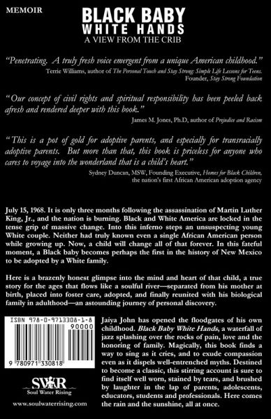 It is only months following the assassination of Martin Luther King, Jr., and the nation is burning. Black and White America are locked in the tense grip of massive change. Into this inferno steps an unsuspecting young White couple. Neither truly knew even a single African American person while growing up. Now, a child will change all of that forever. Over the fateful years to come, a Black child becomes perhaps the first in the history of New Mexico to be adopted by a White family. Here is a brazenly honest glimpse into the mind and heart of that child, a true story for the ages that flows like a soulful river-separated from his mother at birth, placed into foster care, adopted, and finally reunited with his biological family in adulthood-an astounding journey of personal discovery. Jaiya John has opened the floodgates on his own childhood with this piercing memoir. Black Baby White Hands, a waterfall of jazz splashing over the rocks of love, pain and the honoring of family. Magically, this book finds a way to sing as it cries, and to exude compassion even as it dispels well-entrenched myths. This story is sure to find itself well worn, stained by tears, and brushed by laughter in the lap of parents, adolescents, educators, students and professionals. Here comes the rain and the sunshine, all at once.