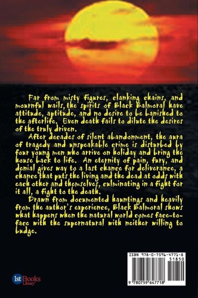 Far from misty figures, clanking chains, and mournful wails the spirits of Black Balmoral have attitude, aptitude, and no desire to be banished to the afterlife. Even death fails to dilute the desires of the truly driven. After decades of silent abandonment, the aura of tragedy and unspeakable crime is disturbed by four young men who arrive on holiday and bring the house back to life. An eternity of pain, fury, and denial gives way to a last chance for deliverance, a chance that puts the living and the dead at odds with each other and themselves, culminating in a fight for it all, a fight to the death. Drawn from documented hauntings and heavily from the author's experience, Black Balmoral shows what happens when the natural world comes face-to-face with the supernatural with neither willing to budge.