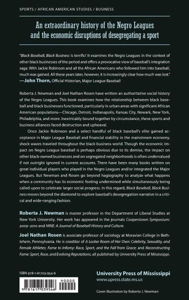 AN EXTRAORDINARY HISTORY OF THE NEGRO LEAGUES AND THE ECONOMIC DISRUPTIONS OF DESEGREGATING A SPORT Roberta J. Newman and Joel Nathan Rosen have written an authoritative social history of the Negro Leagues. This book examines how the relationship between black baseball and black businesses functioned, particularly in urban areas with significant African American populations-Chicago, Detroit, Indianapolis, Kansas City, Newark, New York, Philadelphia, and more. Inextricably bound together by circumstance, these sports and business alliances faced destruction and upheaval. Once Jackie Robinson and a select handful of black baseball's elite gained acceptance in Major League Baseball and financial stability in the mainstream economy, shock waves traveled throughout the black business world. Though the economic impact on Negro League baseball is perhaps obvious due to its demise, the impact on other black-owned businesses and on segregated neighborhoods is often undervalued if not outright ignored in current accounts. There have been many books written on great individual players who played in the Negro Leagues and/or integrated the Major Leagues. But Newman and Rosen move beyond hagiography to analyze what happens when a community has its economic footing undermined while simultaneously being called upon to celebrate a larger social progress. In this regard, Black Baseball, Black Business moves beyond the diamond to explore baseball's desegregation narrative in a critical and wide-ranging fashion. ROBERTA J. NEWMAN, Brooklyn, New York, is master professor in the Department of Liberal Studies at New York University. Her work has appeared in the journals Cooperstown Symposium: 2009-2010 and NINE: A Journal of Baseball History and Culture. JOEL NATHAN ROSEN, Allentown, Pennsylvania, is associate professor of sociology at Moravian College in Bethlehem. He is coeditor of A Locker Room of Her Own: Celebrity, Sexuality, and Female Athletes; Fame to Infamy: Race, Sport, and the Fall from Grace; and Reconstructing Fame: Sport, Race, and Evolving Reputations, all published by University Press of Mississippi.