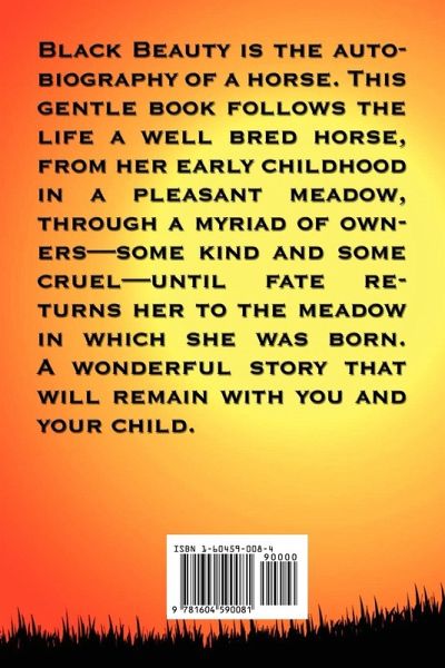 Black Beauty is the autobiography of a horse. This gentle book follows the life a well bred horse, from his early childhood in a pleasant meadow, through a myriad of owners-some kind and some cruel-until fate returns him to the meadow in which he was born. A wonderful story that will remain with you and your child.