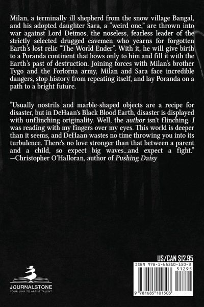 Milan, a terminally ill shepherd from the snow village Bangal, and his adopted daughter Sara, a "weird one," are thrown into war against Lord Deimos, the noseless, fearless leader of the strictly selected drugged cavemen who yearns for forgotten Earth's lost relic "The World Ender". With it, he will give birth to a Poranda continent that bows only to him and fill it with the Earth's past of destruction. Joining forces with Milan's brother Tygo and the Forlorna army, Milan and Sara face incredible dangers, stop history from repeating itself, and lay Poranda on a path to a bright future. "Usually nostrils and marble-shaped objects are a recipe for disaster, but in DeHaan's Black Blood Earth, disaster is displayed with unflinching originality. Well, the author isn't flinching. I was reading with my fingers over my eyes. This world is deeper than it seems, and DeHaan wastes no time throwing you into its turbulence. There's no love stronger than that between a parent and a child, so expect big waves...and expect a fight." -Christopher O'Halloran, author of Pushing Daisy