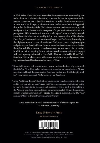 In Black Bodies, White Gold Anna Arabindan-Kesson uses cotton, a commodity central to the slave trade and colonialism, as a focus for new interpretations of the way art, commerce, and colonialism were intertwined in the nineteenth-century Atlantic world. In doing so, Arabindan-Kesson models an art historical approach that makes the histories of the Black diaspora central to nineteenth-century cultural production. She traces the emergence of a speculative vision that informs perceptions of Blackness in which artistic renderings of cotton-as both commodity and material-became inexorably tied to the monetary value of Black bodies. From the production and representation of "negro cloth"-the textile worn by enslaved plantation workers-to depictions of Black sharecroppers in photographs and paintings, Arabindan-Kesson demonstrates that visuality was the mechanism through which Blackness and cotton became equated as resources for extraction. In addition to interrogating the work of nineteenth-century artists, she engages with contemporary artists such as Hank Willis Thomas, Lubaina Himid, and Yinka Shonibare CBE RA, who contend with the commercial and imperial processes shaping constructions of Blackness and meanings of labor.