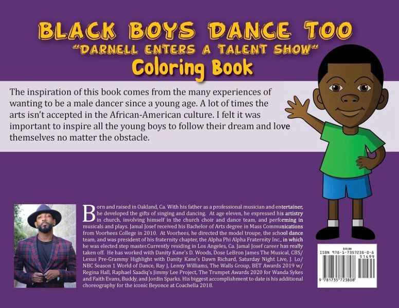This is the coloring book with the pages from the children's book, "Black Boys Dance Too: Darnell Enters a Talent Show". It is an encouraging mini series dedicated to those young black aspiring artist.