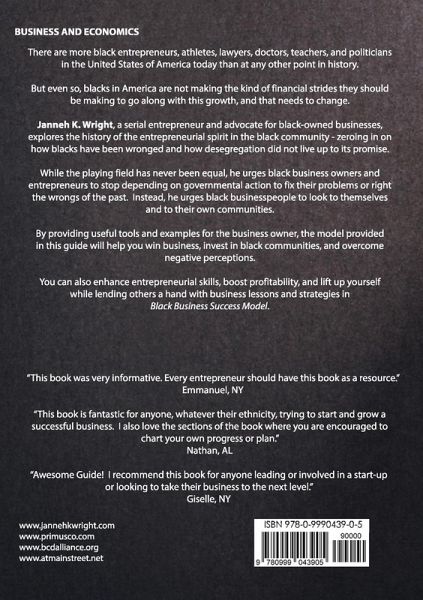 There are more black entrepreneurs, athletes, lawyers, doctors, teachers, and politicians in the United States of America today than at any other point in history. Janneh K. Wright, an entrepreneur and advocate for black-owned businesses, explores the history of the entrepreneurial spirit in the black community-zeroing in on how blacks have been wronged and how desegregation did not live up to its promise. He urges black business owners and entrepreneurs to stop depending on governmental action to fix their problems or right the wrongs of the past. Instead, he urges black busnesspeople to look to themselves and to their own communities. By providing useful tools and examples for the business owner, the model provided in this guide will help you win business, invest in black communities, and overcome negative perceptions. You can also enhance entreprenuerial skills, boost profitability, and lift up yourself while lending others a hand with the lessons and strategies in Black Business Success Model.
