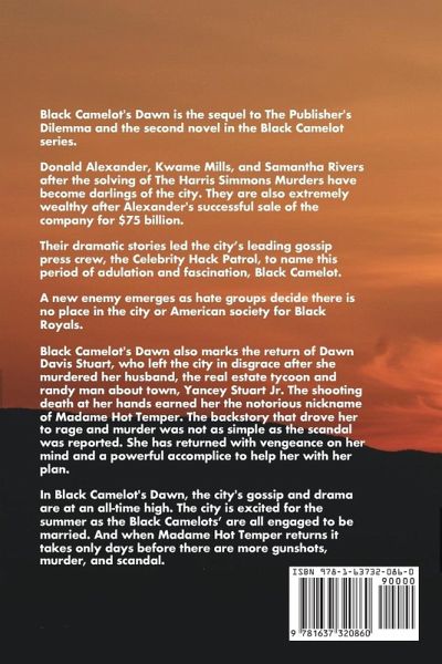 Midwest Book Review Gives Black Camelot's Dawn The Highest Praise: "A high-octane mystery-thriller...Packed with excitement and twisted plots, Black Camelot's Dawn keeps the reader captivated to the last page and is highly recommended....." Midwest Book Review, November, 2021. Black Camelot's Dawn Synopsis Black Camelot's Dawn is the sequel to The Publisher's Dilemma and the second novel in the Black Camelot series. Donald Alexander, Kwame Mills, and Samantha Rivers after the solving of The Harris Simmons Murders have become darlings of the city. They are also extremely wealthy after Alexander's successful sale of the company for $75 billion. Their dramatic stories led the city's leading gossip press crew, the Celebrity Hack Patrol, to name this period of adulation and fascination, Black Camelot. A new enemy emerges as hate groups decide there is no place in the city or American society for Black Royals. Black Camelot's Dawn also marks the return of Dawn Davis Stuart, who left the city in disgrace after she murdered her husband, the real estate tycoon and randy man about town, Yancey Stuart Jr. The shooting death at her hands earned her the notorious nickname of Madame Hot Temper. The backstory that drove her to rage and murder was not as simple as the scandal was reported. She has returned with vengeance on her mind and a powerful accomplice to help her with her plan. In Black Camelot's Dawn, the city's gossip and drama are at an all-time high. The city is excited for the summer as the Black Camelots' are all engaged to be married. And when Madame Hot Temper returns it takes only days before there are more gunshots, murder, and scandal. Read below for reviews by readers. See what they are saying about Black Camelot's Dawn: Lady Dee Great sequel to the murder mystery 'The Publisher's Dilemma'. Fast moving plot filled with intriguing and some amusing personalities. Plot is a showcase of black excellence under attack by a bizarre evil force and an invisible protective force that strives protects them. Does good or evil won in the end? I will have to read Black Camelot Book 3-Days of War to see. Jennifer Jardine I thoroughly enjoyed reading Black Camelot's Dawn. I couldn't put it down. Existing characters evolved in intriguing ways and new characters were introduced with twists and turns in the story that I didn't see coming. It was simply an enjoyable and captivating read. kandy Like reading a film Enjoyable and intriguing, the background characters brought interesting life to the story. Relevant to today's issues in our polarized society. Keep writing and developing the Black Camelot characters we want to see them make a positive change to our world. Very Good work Darius Myers, Bravo! John W. Another OUTSTANDING read! I couldn't put this one, or the first one, down. I'm not much of a fiction reader but these two just drew me in and left me wanting more! Can't wait to see what happens next to Kwame, Don, Tom, Michelle, Carrie, Danielle, Samantha, the Celebrity Hack Patrol and of course, "Madame Hot Temper"! SesameSteve Outstanding! Black Camelot's Dawn is an outstanding follow-up to The Publisher's Dilemma. A great and engaging summertime read. From great characters to unexpected twists and turns, BCD had me turning pages start to finish. Great effort Mr. Myers! Keep them coming!! A Maria Each page adds a layer of curiosity on how things will shape up. There are a few unexpected turns but you become very invested in the characters; like they are a relative. Thumbs up! I can't wait for the next installment.......where is Book #3??