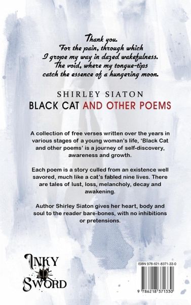 Thank you.For the pain, through which I grope my way in dazed wakefulness.The void, where my tongue-tipscatch the essence of a hungering moon. A collection of free verses written over the years in various stages of a young woman's life, 'Black Cat and other poems' is a journey of self-discovery, awareness and growth. Each poem is a story culled from an existence well savored, much like a cat's fabled nine lives. There are tales of lust, loss, melancholy, decay and awakening. Author Shirley Siaton gives her heart, body and soul to the reader bare-bones, with no inhibitions or pretensions.