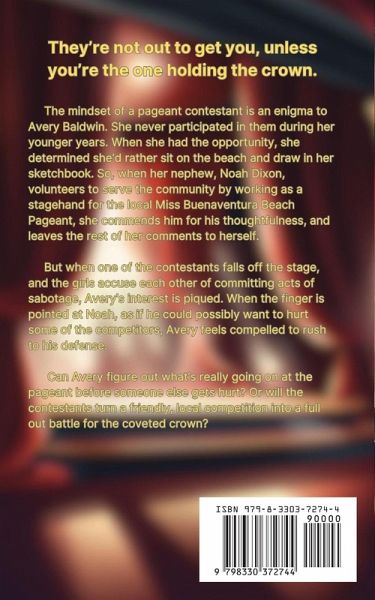 They're not out to get you, unless you're the one holding the crown. The mindset of a pageant contestant is an enigma to Avery Baldwin. She never participated in them during her younger years. When she had the opportunity, she determined she'd rather sit on the beach and draw in her sketchbook. So, when her nephew, Noah Dixon, volunteers to serve the community by working as a stagehand for the local Miss Buenaventura Beach Pageant, she commends him for his thoughtfulness, and leaves the rest of her comments to herself. But when one of the contestants falls off the stage, and the girls accuse each other of committing acts of sabotage, Avery's interest is piqued. When the finger is pointed at Noah, as if he could possibly want to hurt some of the competitors, Avery feels compelled to rush to his defense. Can Avery figure out what's really going on at the pageant before someone else gets hurt? Or will the contestants turn a friendly, local competition into a full out battle for the coveted crown? Find out what happens by reading Black Cherry Chillers and Conniving Beauty Queens, Book Three in the Buenaventura Beach Mystery Series.