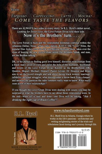 There are ALWAYS two sides to every story. In R.L. Byrd's debut novel, Looking for Sweet Love, the Love Forum Divas told their side. Now it's the Brothers turn. . . . The Love Forum is back and the relationship dilemmas continue within the infamous Dallas, Texas, urban radio station, K103.5. DK "Love" Niles, the popular Disc Jockey from the DK and Melissa Morning Show, takes over the reins of hosting the new Love Forum called The Brothers Speak; and man, are the Brothas talking. DK, in his pursuit of finding good love himself, discusses relationships from a black man's point of view and enlist the help of the husbands, boyfriends and lovers of the Love Forum Divas. Known as the Brotherhood: DK, Quentin, Miguel, Michael, Donnell, Pastor Levine, Dr. Houston and Brass aim to set the record straight and talk about dating black women, marriage, infidelity, personal struggles, what distinguishes a throw-back from a keeper, and they answer the question the radio listeners really want to know . . . what really went down in their relationships? If you thought the Love Forum Divas were dealing with issues, you may be surprised at what the brothers have to say about those relationship woes. In the end-when all is said and done-one Diva will be asking, "Am I drinking the right cup of Black Coffee?"