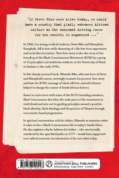 'If Steve Biko were alive today, we would have a country that gladly embraces African culture as the dominant driving force for how society is organised ...' In 1968, two young medical students, Steve Biko and Mamphela Ramphele, fell in love while dreaming of a life free from oppression and racial discrimination. Their love story is also the story of the founding of the Black Consciousness Movement (BCM) by a group of 15 principled and ambitious students at the University of Natal in Durban in the early 1970s. In this deeply personal book, Hlumelo Biko, who was born of Steve and Mamphela's union, movingly recounts his parents' love story and how the BCM's message of black self-love and self-reliance helped to change the course of South African history. Based on interviews with some of the BCM's founding members, Black Consciousness describes the early years of the movement in vivid detail and sets out its guiding principles around a positive black identity, black theology and the practice of Ubuntu through community-based programmes. In spiritual conversation with his father, Hlumelo re-examines what it takes to live a Black Consciousness life in today's South Africa. He also explains why he believes his father - who was brutally murdered by the apartheid police in 1977 - would have supported true radical economic transformation if he were alive today.
