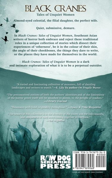*Winner of the Bram Stoker & Shirley Jackson Awards* Almond-eyed celestial, the filial daughter, the perfect wife. Quiet, submissive, demure. In Black Cranes, Southeast Asian writers of horror both embrace and reject these traditional roles in a unique collection of stories which dissect their experiences of 'otherness, ' be it in the colour of their skin, the angle of their cheekbones, the things they dare to write, or the places they have made for themselves in the world. Black Cranes is a dark and intimate exploration of what it is to be a perpetual outsider. NEW EDITION This Bram Stoker and Shirley Jackson Award-winning anthology in which Southeast Asian authors explore what it's like to feel otherness, took the literary horror communities and readers by storm in 2020 when it was first released. Now, Raw Dog Screaming Press is proud to re-release it in hardcover and paperback. The hardcover edition has new cover art by Greg Chapman, synching artistically to other books within the Black Cranes universe. The interior has been redesigned by book guru Todd Keisling who has incorporated images and textures for a lush reading experience. A new afterword by Nancy Holder, six-time Bram Stoker Award winner and New York Times best-selling author has been added to this edition. Many of the stories included have been recognized individually. Grace Chan's Aurealis-nominated story "The Mark," was shortlisted for Australia's Norma K. Hemming Award, which recognizes excellence in the exploration of themes of race, gender, sexuality, class, or disability in a published speculative fiction work. The Eugie Foster was also awarded for Elaine Cuyegkeng's story "The Genetic Alchemist's Daughter." Black Cranes was an Aurealis Award Finalist, Australian Shadows Award Finalist, British Fantasy Award Finalist, and was Locus Award Recommended Praise for Black Cranes "A varied and fascinating collection of monsters, full of dazzling landscapes and writers to watch."-E. Lily Yu author On Fragile Waves "As haunting and versatile as the Chinese erhu, the stories in Black Cranes pluck and bow the strings of the Southeast Asian experience with insightful depth and resonance." -Tori Eldridge, author of the Lily Wong series "The preconceived notions of both the authors' identities and of the limitations of the horror genre itself will be smashed to pieces, to the delight of readers." -Library Journal "A bloody-toothed smile hidden behind the hand of propriety and social expectation."-Pseudopod "Resonates with bold originality throughout." -Space & Time Magazine "The beauty of this collection is in the diversity of the voices and the individuality and uniqueness of each story coming together in one book." -Tor Nightfire "Lyrical and haunting prose... This is dark, reflective fiction at its best." -Tomes and Tales