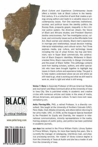 Contents: Venise T. Berry: From Slavery to the Presidency - Tabbye M. Chavous/Seanna Leath/Bridget L. Richardson: Black Racial Identity: Promoting Academic Achievement and Excellence, Resisting Stereotypes, and the Myth of Acting White - John A. Fortunato/Jerome D. Williams: The NFL's Rooney Rule: A Theoretical Analysis of Its Societal Influence - Kayla Renée Wheeler: In God's Favor: Prosperity Gospel in the 21st Century - Stephana Colbert: Race and Racism: Inequalities in the Criminal Justice System - LaToya T. Brackett: Attaining Wealth: The African American Struggle for the «American Dream» - De Anna Reese/Malik Simba: Learning from History: Contemporary Issues in Black and Africana Studies - Anita Fleming-Rife: To Form a More Perfect Union: Frames of Double Consciousness in Presidential Candidate Barack Obama's Race Speech - Staja Q. Booker/Tamara A. Baker: Pain, Chronic Disease, and the ACA: Implications for Better Healthcare in the Black Community - E-K Daufin: Big, Black, and Beautiful Women: Health at Every Size Offers a New Paradigm - Armon R. Perry/Derrick R. Brooms/Siobhan E. Smith: Birds of a Feather? Black Men's Experiences and Behavior in Marriage and Romantic Relationships - Asher Pimpleton/Nikita Murry: Fifty Shades of Brown: Understanding the Social, Sensual, and Sexual Lives of Black American Women - Danielle M. Wallace/Sonja Peterson-Lewis: Interracial Relationships: Attitudes among Heterosexual College-Educated African American Women - William Oliver: Cultural Racism and Violence in African American Communities - Kristina Graaff/Vanessa Irvin: The Rise of Urban Fiction - Donnetrice C. Allison: An Affair to Remember: Hip Hop and the Feminist Perspective - Ernest L. Wiggins/Kenneth Campbell: (Un)Comfortable Contact? Viewing Race and Interaction in 25 Years of Super Bowl Commercials through the Lens of Social Distance - Ilia Rodríguez: The Construction of Black Diasporic Identities in News Discourse on Immigration in the U.S. Black Press - Omotayo O. Banjo: Now You See Me: The Visibility of Whiteness in Black Context Films - Tammie Jenkins: Black Masculinity and Representation in Popular Culture: A Case Study of Quentin Tarantino's Film Django Unchained - George L. Daniels/Theadoris Morris/Ellisa Bray: Bridging the Digital Divide: The Case of Black Twitter as a 21st-Century Platform for Cultural Expression.