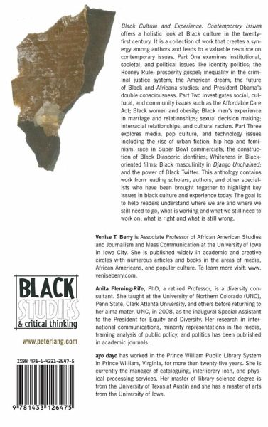 Contents: Venise T. Berry: From Slavery to the Presidency - Tabbye M. Chavous/Seanna Leath/Bridget L. Richardson: Black Racial Identity: Promoting Academic Achievement and Excellence, Resisting Stereotypes, and the Myth of Acting White - John A. Fortunato/Jerome D. Williams: The NFL's Rooney Rule: A Theoretical Analysis of Its Societal Influence - Kayla Renée Wheeler: In God's Favor: Prosperity Gospel in the 21st Century - Stephana Colbert: Race and Racism: Inequalities in the Criminal Justice System - LaToya T. Brackett: Attaining Wealth: The African American Struggle for the «American Dream» - De Anna Reese/Malik Simba: Learning from History: Contemporary Issues in Black and Africana Studies - Anita Fleming-Rife: To Form a More Perfect Union: Frames of Double Consciousness in Presidential Candidate Barack Obama's Race Speech - Staja Q. Booker/Tamara A. Baker: Pain, Chronic Disease, and the ACA: Implications for Better Healthcare in the Black Community - E-K Daufin: Big, Black, and Beautiful Women: Health at Every Size Offers a New Paradigm - Armon R. Perry/Derrick R. Brooms/Siobhan E. Smith: Birds of a Feather? Black Men's Experiences and Behavior in Marriage and Romantic Relationships - Asher Pimpleton/Nikita Murry: Fifty Shades of Brown: Understanding the Social, Sensual, and Sexual Lives of Black American Women - Danielle M. Wallace/Sonja Peterson-Lewis: Interracial Relationships: Attitudes among Heterosexual College-Educated African American Women - William Oliver: Cultural Racism and Violence in African American Communities - Kristina Graaff/Vanessa Irvin: The Rise of Urban Fiction - Donnetrice C. Allison: An Affair to Remember: Hip Hop and the Feminist Perspective - Ernest L. Wiggins/Kenneth Campbell: (Un)Comfortable Contact? Viewing Race and Interaction in 25 Years of Super Bowl Commercials through the Lens of Social Distance - Ilia Rodríguez: The Construction of Black Diasporic Identities in News Discourse on Immigration in the U.S. Black Press - Omotayo O. Banjo: Now You See Me: The Visibility of Whiteness in Black Context Films - Tammie Jenkins: Black Masculinity and Representation in Popular Culture: A Case Study of Quentin Tarantino's Film Django Unchained - George L. Daniels/Theadoris Morris/Ellisa Bray: Bridging the Digital Divide: The Case of Black Twitter as a 21st-Century Platform for Cultural Expression.