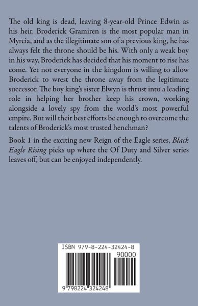 The old king is dead, leaving 8-year-old Prince Edwin as his heir. Broderick Gramiren is the most popular man in Myrcia, and as the illegitimate son of a previous king, he has always felt the throne should be his. With only a weak boy in his way, Broderick has decided that his moment to rise has come. Yet not everyone in the kingdom is willing to allow Broderick to wrest the throne away from the legitimate successor. The boy king's sister Elwyn is thrust into a leading role in helping her brother keep his crown, working alongside a lovely spy from the world's most powerful empire. But will their best efforts be enough to overcome the talents of Broderick's most trusted henchman? Book 1 in the exciting new Reign of the Eagle series, Black Eagle Rising picks up where the Of Duty and Silver series leaves off, but can be enjoyed independently.