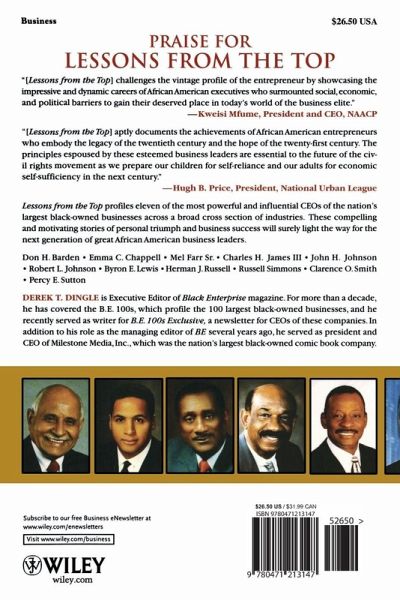 PRAISE FOR LESSONS FROM THE TOP "[Lessons from the Top] challenges the vintage profile of the entrepreneur by showcasing the impressive and dynamic careers of African American executives who surmounted social, economic, and political barriers to gain their deserved place in today's world of the business elite." -Kweisi Mfume, President and CEO, NAACP "[Lessons from the Top] aptly documents the achievements of African American entrepreneurs who embody the legacy of the twentieth century and the hope of the twenty-first century. The principles espoused by these esteemed business leaders are essential to the future of the civil rights movement as we prepare our children for self-reliance and our adults for economic self-sufficiency in the next century." -Hugh B. Price, President, National Urban League Lessons from the Top profiles eleven of the most powerful and influential CEOs of the nation's largest black-owned businesses across a broad cross section of industries. These compelling and motivating stories of personal triumph and business success will surely light the way for the next generation of great African American business leaders. Don H. Barden - Emma C. Chappell - Mel Farr Sr. - Charles H. James III - John H. Johnson - Robert L. Johnson - Byron E. Lewis - Herman J. Russell - Russell Simmons - Clarence O. Smith - Percy E. Sutton
