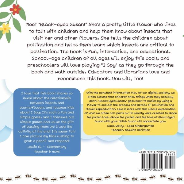 Meet "Black-eyed Susan!" She's a pretty little flower who likes to talk with children and help them know about insects that visit her and other flowers. She tells the children about pollination and helps them learn which insects are critical to pollination. The book is fun, interactive, and educational. School-age children of all ages will enjoy this book, and preschoolers will love playing "I Spy" as they go through the book and walk outside. Educators and librarians love and recommend this book. You will, too!
