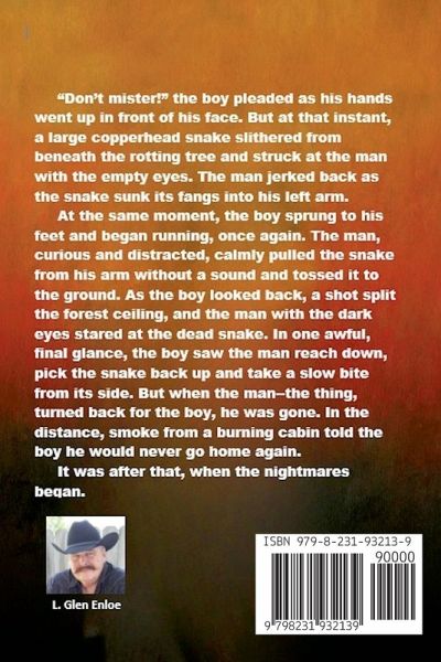 "Don't Mister!" the boy pleaded as his hands went up in front of his face. But at that instant, a large copperhead snake slithered from beneath the rotting tree and struck at the man with the empty eyes. The man jerked back as the snake sunk its fangs into his left arm. At the same moment, the boy sprung to his feet and began running once again. The man, curious and distracted, calmly pulled the snake from his arm without a sound and tossed it to the ground. As the boy looked back, a shot split the forest ceiling, and the man with the dark eyes stared at the dead snake. In one awful final glance, the boy saw the man reach down, pick the snake back up and take a slow bite from its side. But when the man--the thing, turned back for the boy, he was gone. In the distance, smoke from a burning cabin told the boy he would never go home again. It was after that when the nightmares began.