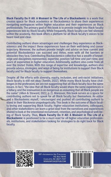 Black Faculty Do It All: A Moment in The Life of a Blackademic is a work that creates space for Black academics or Blackademics to share their experiences navigating workspaces within higher education and their experiences as Black professionals. The primary goal of this book is to provide insight into Black faculty experiences told by Black faculty. While frequently, Black faculty can feel silenced within the academy, this book offers a platform for all Black faculty's voices to be heard loud and clear. Contributing authors share advantages and challenges they experience as Blackademics and the impact these experiences have on their well-being and career trajectory. Moreover, the authors provide insight and advice on how current and potential Blackademics can succeed and thrive, even with all the barriers or obstacles they face. Contributing Blackacdemics collective has a wealth of knowledge and disciplines represented, expertise, position full-time and part-time, and years of experience in higher education. Additionally, authors also come from all over the United States. With this range of expertise and knowledge, authors also provide advice, strategies, and ways of being for institutions to support their Black faculty and for Black faculty to support themselves. Despite all the efforts with diversity, equity, inclusion, and anti-racist initiatives, Black faculty is still not okay (Tomlin, 2022). While many Black faculty have challenges in the profession, we are not suggesting that all Black faculty face the same issues. In fact, "the idea that all Black faculty would share the same experiences is a fallacy, and the insinuation is as dangerous as assuming that all Black people are the same" (Allen & Steward, 2022, p. 2). Moreover, this book serves as a space for contributing authors not to speak for all Black faculty but themselves. As editor and a Blackademic myself, I encouraged and pushed all contributing authors to stand in their Blackness unapologetically. This book is the outcome of Black faculty loving and supporting Black faculty. Higher education institutions, colleagues, and other stakeholders can learn a great deal from the narratives and experiences shared to look at the intentional recruitment, retention, and psychological well-being of Black faculty. Thus, Black Faculty Do It All: A Moment in The Life of a Blackademic is positioned to be a must-read for all higher education professionals, institutions, and stakeholders looking for strategies to do right back for Black faculty.