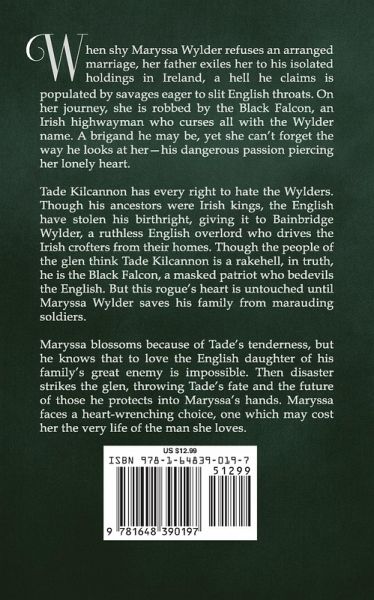 An unloved English heiress... When shy Maryssa Wylder refuses an arranged marriage, her father exiles her to his isolated holdings in Ireland, a hell he claims is populated by savages eager to slit English throats. On her journey, she is robbed by the Black Falcon, an Irish highwayman who curses all with the Wylder name. A brigand he may be, yet she can't forget the way he looks at her-his dangerous passion piercing her lonely heart. A dispossessed Irish prince... Tade Kilcannon has every right to hate the Wylders. Though his ancestors were Irish kings, the English have stolen his birthright, giving it to Bainbridge Wylder, a ruthless English overlord who drives the Irish crofters from their homes. Though the people of the glen think Tade Kilcannon is a rakehell, in truth, he is the Black Falcon, a masked patriot who bedevils the English. But this rogue's heart is untouched until Maryssa Wylder saves his family from marauding soldiers. A love worth defying two worlds... Maryssa blossoms because of Tade's tenderness, but he knows that to love the English daughter of his family's great enemy is impossible. Then disaster strikes the glen, throwing Tade's fate and the future of those he protects into Maryssa's hands. Maryssa faces a heart-wrenching choice, one which may cost her the very life of the man she loves.