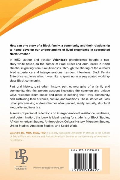 How can one story of a Black family, a community and their relationship to home develop our understanding of lived experience in segregated North Omaha? In 1952, author and scholar Valandra's grandparents bought a two-story white house on the corner of Pratt Street and 28th Street in North Omaha, migrating from rural Arkansas. Through the sharing of the author's lived experience and intergenerational resident interviews, Black Family Enterprise explores what it was like to grow up in a segregated working-class Black community. Part oral history, part urban history, part ethnography of a family and community, this first-person account illustrates the common and unique ways residents claim space and place in defining their lives, community, and sustaining their histories, culture, and traditions. These stories of Black urban placemaking address themes of mutual aid, safety, security, structural inequality and injustice. A series of personal reflections on intergenerational resistance, resilience, and determination, this book is ideal reading for students of Black Studies, African American Studies, Anthropology, Cultural History, Migration Studies, Urban Studies, American Studies, and Social Work.