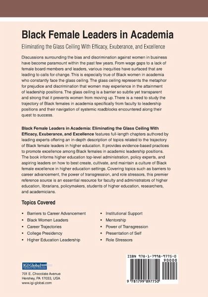 Discussions surrounding the bias and discrimination against women in business have become paramount within the past few years. From wage gaps to a lack of female board members and leaders, various inequities have surfaced that are leading to calls for change. This is especially true of Black women in academia who constantly face the glass ceiling. The glass ceiling represents the metaphor for prejudice and discrimination that women may experience in the attainment of leadership positions. The glass ceiling is a barrier so subtle yet transparent and strong that it prevents women from moving up. There is a need to study the trajectory of Black females in academia specifically from faculty to leadership positions and their navigation of systemic roadblocks encountered along their quest to success. Black Female Leaders in Academia: Eliminating the Glass Ceiling With Efficacy, Exuberance, and Excellence features full-length chapters authored by leading experts offering an in-depth description of topics related to the trajectory of Black female leaders in higher education. It provides evidence-based practices to promote excellence among Black females in academic leadership positions. The book informs higher education top-level administration, policy experts, and aspiring leaders on how to best create, cultivate, and maintain a culture of Black female excellence in higher education settings. Covering topics such as barriers to career advancement, the power of transgression, and role stressors, this premier reference source is an essential resource for faculty and administrators of higher education, librarians, policymakers, students of higher education, researchers, and academicians.