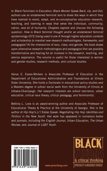 In Black Feminism in Education: Black Women Speak Back, Up, and Out, authors use an endarkened feminist lens to share the ways in which they have learned to resist, adapt, and re-conceptualize education research, teaching, and learning in ways that serve the individual, community, nation, and all of humanity. Chapters explore and discuss the following question: How is Black feminist thought and/or an endarkened feminist epistemology (EFE) being used in pre-K through higher education contexts and scholarship to marshal new research methodologies, frameworks, and pedagogies? At the intersection of race, class, and gender, the book draws upon alternative research methodologies and pedagogies that are possibly transformative and healing for all involved in the research, teaching, and service experience. The volume is useful for those interested in women and gender studies, research methods, and cultural studies.
