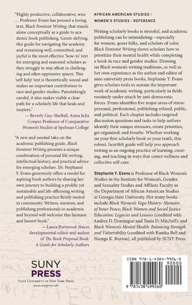 Draws on the rich history of Black feminist writing to help scholars manage the stress of writing and publishing academic books. Writing scholarly books is stressful, and academic publishing can be intimidating-especially for women, queer folks, and scholars of color. Black Feminist Writing shows scholars how to prioritize their mental health while completing a book in race and gender studies. Drawing on Black women's writing traditions, as well as her own experience as the author and editor of nine university press books, Stephanie Y. Evans gives scholars tools to sustain the important work of academic writing, particularly in fields routinely under attack by anti-democratic forces. Evans identifies five major areas of stress: personal, professional, publishing-related, public, and political. Each chapter includes targeted discussion questions and tasks to help authors identify their unique stressors, create priorities, get organized, and breathe. Whether working on your first scholarly book or your tenth, this robust, heartfelt guide will help you approach writing as an ongoing practice of learning, creating, and teaching in ways that center wellness and collective self-care.