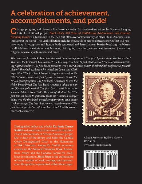 A celebration of achievement, accomplishments, and pride! The first African American president, U.S. senator, and the first black lawyer in the Department of Education. The first black chairman of the U.S. Joint Chiefs of Staff and the first African American commissioned officer in the Marine Corps. The first black professors in a variety of fields. The first African American advertising agency. The first African American Olympian. The first black pilot for a scheduled commercial airline. The first recorded slave revolt in North America. The first African American cookbook writer. Revel and rejoice in the renowned and lesser-known, barrier-breaking trailblazers in all fields-arts, entertainment, business, civil rights, education, government, invention, journalism, religion, science, sports, music, and more. Black Firsts: 500 Years of Trailblazing Achievements and Ground-Breaking Events, Fourth Edition bears witness to the long and complex history of African Americans! Expanded, updated, and revised for the first time in over eight years, Black Firsts collects more than 500 all-new achievements and previously unearthed firsts. This massive tome proves that African American accomplishments are wide-ranging and ongoing, documenting thousands of personal victories and triumphs. 1. Who was the first black American depicted on a postage stamp? (1940 Booker Taliaferro Washington) 2. Who was the first African American bookseller? (1834 David Ruggles, New York City) 3. Where was the first black car dealership? (1941 Edward Davis, Detroit, Studebaker) 4. When was the first black-owned company listed on a major stock exchange? ( 1971 Johnson Products) 5. Who was the first black U.S. senator? (1870 Hiram Rhoades [Rhodes] Revels, Mississippi) 6. Who was the African American columnist who won a Pulitzer Prize for Commentary? (1989 Clarence Page) 7. Who was the U.S. Supreme Court's first black justice? (1967 Thurgood Marshall) 8. Who first broke the color barrier to become a flight attendant? (1958 Ruth Carol Taylor) 9. Who became the first black to graduate from the U.S. Military Academy at West Point? (1877 Henry Ossian Flipper) 10. Which model was the first black to grace Sports Illustrated cover? (1997 Tyra Banks) 11. Who became the American Medical Association's first black president? (1995 Lonnie Bristow) 12. What is the oldest surviving black church in America? (The African Meeting House, built in 1806 and known as the Joy Street Baptist Church, in Boston ) 13. Who became the first black pitcher to win a World Series game? (1952 Rookie of the Year, Joe Black, of the Brooklyn Dodgers) 14. Who was the first regularly recognized black physician in the United States? (1780s James Durham [Derham]) 15. Who was the first black actress to receive an Emmy Award? (1969 Gail Fisher ) 16. Who became the first black professional football player? (1904 Charles W. Follis) 17. What was first short story published by a black woman in the United States? (1859 Frances Ellen Watkins Harper's "The Two Offers") 18. Who was the black explorer who joined the Lewis and Clark expedition? ( York) 19. Who was the first black lawyer to argue a case before the Supreme Court? ( 1880 Samuel R. Lowery) 20. Which two songs by black Americans were the first to be send out of the solar system? (1977 Chuck Berry's song "Johnny B. Goode" and Blind Willie Johnson's "Dark Was the Night, Cold Was the Ground" on Voyager I) 21. What famous inventor and agronomist has a national monument named after him in Diamond, Missouri? (1960 George Washington Carver) 22. What movie featured the first black female lead in a Disney animated feature? (2009 "The Princess and the Frog" starred Anika Noni Rose) 23. Who was the first black American to win a gold medal in the women's all-around final competition.? (2012 Gabrielle "Gabby" Christina Victoria Douglas) 24. Who were the Tuskegee Airmen and why are they so famous? (1941 The U.S. Congress established the first combat unit for blacks in the Army Air Corps with a training facility for black airmen, known as the Tuskegee Airmen, located at Tuskegee Institute, Alabama) 25. Who participated in the first armed encounter of the American Revolution and later became the first black to receive an honorary master's degree? ( Lemuel Haynes) 26. Who was the author of a book of poetry that won the first Pulitzer Prize awarded to a black American? (1950 Gwendolyn Brooks for "Annie Allen") 27. What was the first black record company? (Pace Phonograph Company established 1921 by Henry Pace) 28. Who was the black hero who sacrificed himself at the Boston Massacre, an event that would help inspire the American Revolution? (1770 Crispus Attucks) 29. Who was the first black entertainer to host his own talk show on national television? (1989 Arsenio Hall) 30. Who was the first African American to lead the NASA space program? (2009 Charles Frank Bolden Jr.) 31. Who was the first black American to win the Nobel Peace Prize? (1944 Ralph Johnson Bunche) 32. Who was the first black American athlete to win an Olympic gold medal? ( 1908 John Baxter "Doc" Taylor Jr. winner of the 4 X 400-meter relay in London) 33. Which inventor had the first patent granted an African American? (1872 Elijah McCoy) 34. Who was the first African American to win a Grammy Award? (1959 Count [William] Basie) 35. Who is thought to be the United States' first black millionaire? (1890 Thomy Lafon, New Orleans real estate speculator and moneylender) 36. Who was the first black named Association of College and Research Librarian of the Year? (1985 Jessie Carney Smith) 37. Which black first sang a principal role with the Metropolitan Opera? (1955 Marian Anderson) 38. When was the first black judge appointed to the U.S. Court of Appeals? ( 1966 Spottswood Robinson) 39. Which black artist was the first to be featured in a solo exhibit at New York's Museum of Modern Art? (1937 William Edmondson) 40. When was the first black mayor of Dallas elected? (1995 Ro