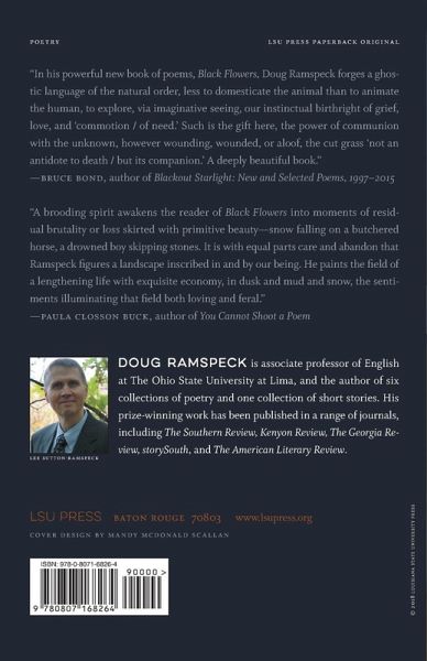 In dark, lyrical verse, Black Flowers follows a speaker from childhood into adulthood, as he navigates the animistic world of crows, conjurings, and winter snows. Doug Ramspeck guides readers through the brutality and beauty found in the natural world: the moonlight, "marrow-white, severed, falling bodily / to grass, the hours as permeable as clay" and "dust lifting across the road / as though to form a human shape." By juxtaposing euphony and clear, startling imagery, Ramspeck's novelistic new collection molds the landscape to reflect the speaker's memories and the challenges of growing up in a dysfunctional family. In the tradition of William Wordsworth, Black Flowers brings the flourishes of the Romantics to the grit of the present day.