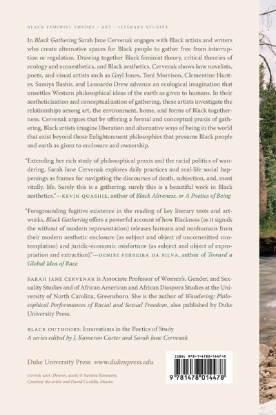 In Black Gathering Sarah Jane Cervenak engages with Black artists and writers who create alternative spaces for Black people to gather free from interruption or regulation. Drawing together Black feminist theory, critical theories of ecology and ecoaesthetics, and Black aesthetics, Cervenak shows how novelists, poets, and visual artists such as Gayl Jones, Toni Morrison, Clementine Hunter, Samiya Bashir, and Leonardo Drew advance an ecological imagination that unsettles Western philosophical ideas of the earth as given to humans. In their aestheticization and conceptualization of gathering, these artists investigate the relationships among art, the environment, home, and forms of Black togetherness. Cervenak argues that by offering a formal and conceptual praxis of gathering, Black artists imagine liberation and alternative ways of being in the world that exist beyond those Enlightenment philosophies that presume Black people and earth as given to enclosure and ownership.