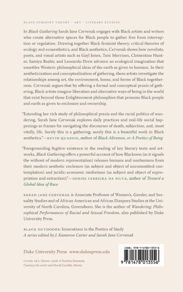 In Black Gathering Sarah Jane Cervenak engages with Black artists and writers who create alternative spaces for Black people to gather free from interruption or regulation. Drawing together Black feminist theory, critical theories of ecology and ecoaesthetics, and Black aesthetics, Cervenak shows how novelists, poets, and visual artists such as Gayl Jones, Toni Morrison, Clementine Hunter, Samiya Bashir, and Leonardo Drew advance an ecological imagination that unsettles Western philosophical ideas of the earth as given to humans. In their aestheticization and conceptualization of gathering, these artists investigate the relationships among art, the environment, home, and forms of Black togetherness. Cervenak argues that by offering a formal and conceptual praxis of gathering, Black artists imagine liberation and alternative ways of being in the world that exist beyond those Enlightenment philosophies that presume Black people and earth as given to enclosure and ownership.
