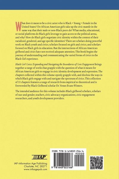 What does it mean to be a civic actor who is Black + Young + Female in the United States? Do African American girls take up the civic mantle in the same way that their male or non-Black peers do? What media, educational, or social platforms do Black girls leverage to gain access to the political arena, and why? How do Black girls negotiate civic identity within the context of their racialized, gendered, and age specific identities? There are scholars doing powerful work on Black youth and civics; scholars focused on girls and civics; and scholars focused on Black girls in education. But the intersections of African American girlhood and civics have not received adequate attention. This book begins the journey of understanding and communicating the varied forms of civics in the Black Girl experience. Black Girl Civics: Expanding and Navigating the Boundaries of Civic Engagement brings together a range of works that grapple with the question of what it means for African American girls to engage in civic identity development and expression. The chapters collected within this volume openly grapple with, and disclose the ways in which Black girls engage with and navigate the spectrum of civics. This collection of 11 chapters features a range of research from empirical to theoretical and is forwarded by Black Girlhood scholar Dr. Venus Evans-Winters. The intended audience for this volume includes Black girlhood scholars, scholars of race and gender, teachers, civic advocacy organizations, civic engagement researchers, and youth development providers.