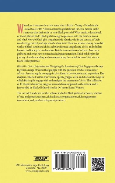 What does it mean to be a civic actor who is Black + Young + Female in the United States? Do African American girls take up the civic mantle in the same way that their male or non-Black peers do? What media, educational, or social platforms do Black girls leverage to gain access to the political arena, and why? How do Black girls negotiate civic identity within the context of their racialized, gendered, and age specific identities? There are scholars doing powerful work on Black youth and civics; scholars focused on girls and civics; and scholars focused on Black girls in education. But the intersections of African American girlhood and civics have not received adequate attention. This book begins the journey of understanding and communicating the varied forms of civics in the Black Girl experience. Black Girl Civics: Expanding and Navigating the Boundaries of Civic Engagement brings together a range of works that grapple with the question of what it means for African American girls to engage in civic identity development and expression. The chapters collected within this volume openly grapple with, and disclose the ways in which Black girls engage with and navigate the spectrum of civics. This collection of 11 chapters features a range of research from empirical to theoretical and is forwarded by Black Girlhood scholar Dr. Venus Evans-Winters. The intended audience for this volume includes Black girlhood scholars, scholars of race and gender, teachers, civic advocacy organizations, civic engagement researchers, and youth development providers.