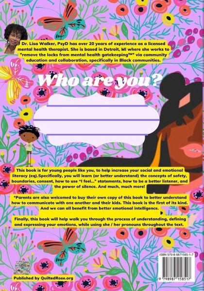 This book is for young people like you to help you increase your social and emotional knowledge, your understanding of the concepts of safety, boundaries, consent and provides coping and relaxation skills. *Parents are also welcomed to buy their own copy of this book to better understand how to communicate with one another and their kids. This book is the first of its kind. And we all can benefit from better emotional intelligence. Also, this book will help walk you through the process of helping you best define, understand, and express your emotions while using she / her pronouns throughout the text.