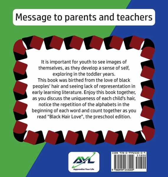 It is important for black youth to see images of themselves, as they develop a sense of self and explore during their toddler years. This book was birthed from the love of black peoples' hair and seeing lack of representation in early learning literature. Enjoy this preschool edition as you discuss the uniqueness of each child's hair, notice the repetition of the alphabet in the beginning of each word, and count together as you read Black Hair Love for preschoolers.