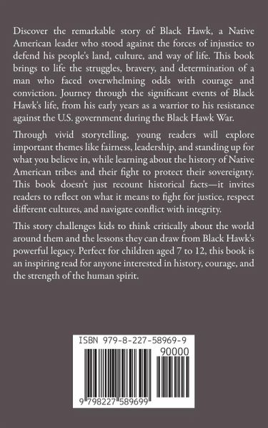 Discover the remarkable story of Black Hawk, a Native American leader who stood against the forces of injustice to defend his people's land, culture, and way of life. This book brings to life the struggles, bravery, and determination of a man who faced overwhelming odds with courage and conviction. Journey through the significant events of Black Hawk's life, from his early years as a warrior to his resistance against the U.S. government during the Black Hawk War. Through vivid storytelling, young readers will explore important themes like fairness, leadership, and standing up for what you believe in, while learning about the history of Native American tribes and their fight to protect their sovereignty. This book doesn't just recount historical facts-it invites readers to reflect on what it means to fight for justice, respect different cultures, and navigate conflict with integrity. This story challenges kids to think critically about the world around them and the lessons they can draw from Black Hawk's powerful legacy. Perfect for children aged 7 to 12, this book is an inspiring read for anyone interested in history, courage, and the strength of the human spirit.