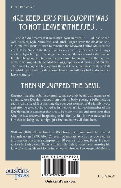 Severely beaten and sexually assaulted weekly by his foster father, Ace Keebler withdrew into a world of darkness where he nurtured a festering hate for his fellow man. On his sixteenth birthday, Keebler left his foster parents dead on the floor of their burning ranch house and set out on his own. Everything that Ace acquired from that day on he took, and it wasn't healthy for those he chose as victims. It was the outlaw's philosophy to never leave witnesses, and he could not understand why someone should be allowed to live who could testify against him. Two years after Keebler began his life of crime, he met two men in an all-night poker game who had the same values as he about another's life . . . zero. The two conveyed to Ace that they liked his attitude about not leaving witnesses, and the next day Keebler took them on as partners. The advent of that relationship began a shocking, monstrous crime spree that crisscrossed the Midwestern United States for years. Life was good for the three men: easy money and leisure living without having to worry about getting caught, and all they had to do was not leave witnesses. Kyle Mannford and Jubal Burgan brought a new dimension of lawlessness to the gang. For their pleasure, victims were brutally beaten, raped, or mentally tortured before receiving the fatal shot to the head. Kyle and Jubal had no problem with this type of merriment. After all, what was the big deal; the victims were going to die anyhow. On a warm spring afternoon in May 1850, the gang robbed an Illinois family of a significant amount of money they had received from an inheritance. Kyle and Jubal, and now Ace, beat and raped the mother and her children, while making the father watch helplessly as the brutality took place. After the fun ended, Ace shot each of the victims in the head as always, but this time was different. The youngest member of the family, a 10-year old boy, did not die and was nursed back to health. After coming out of a two-day com
