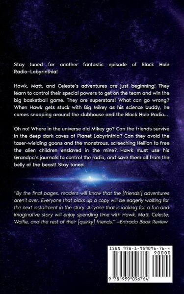 Stay tuned for another exciting episode of Black Hole Radio-Labyrinthia! Hawk, Matt, and Celeste's adventures are just beginning! They learn to control their special powers to get on the team and win the big basketball game. They are superstars! What can go wrong? When Hawk gets stuck with Big Mikey as his science buddy, he comes snooping around the clubhouse and the Black Hole Radio . . . Beep! Beep! Beep! Not again! Can the friends survive in the deep dark caves of Planet Labyrinthia? Can they avoid the taser-wielding goons and the monstrous, screeching Hellion to free the alien children enslaved in the mine? Hawk must use his grandpa's journals to control the radio and save them all from the belly of the beast . . . but where's Mikey! Stay tuned! "By the final pages, readers will know that the [friends'] adventures aren't over. Everyone that picks up a copy will be eagerly waiting for the next installment in the story. Anyone that is looking for a fun and imaginative story will enjoy spending time with Hawk, Matt, Celeste, Wolfie, and the rest of their [quirky] friends." -Entrada Book Review