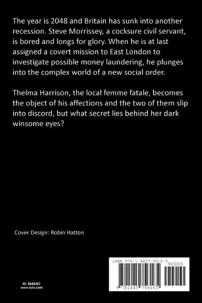 The year is 2048 and Britain has sunk into another recession. Steve Morrissey, a cocksure civil servant, is bored and longs for glory. When he is at last assigned a covert mission to East London to investigate possible money laundering, he plunges into the complex world of a new social order. Thelma Harrison, the local femme fatale, becomes the object of his affections and the two of them slip into discord, but what secret lies behind her dark winsome eyes?
