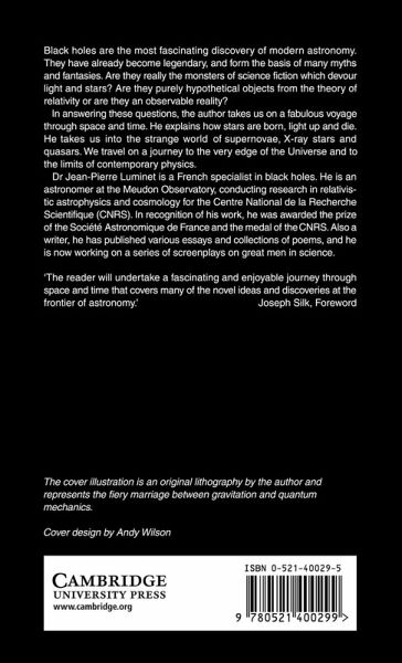 Black holes are undoubtedly one of the most fascinating discoveries of modern astronomy, and their description one of the most daring intellectual feats of modern times. They have already become legendary, forming the basis of many myths, fantasies and science fiction movies. Are they really the monsters which devour light and stars; bottomless celestial pits into which all matter is sucked and crushed? Are they an observable reality, or are they just hypothetical objects from the theory of relativity? In answering such questions the author takes us on a fabulous journey through space and time. Dr Jean-Pierre Luminet is an astronomer at Meudon Observatory in France, a specialist on the subject of black holes, and has also acquired a reputation for being a gifted writer and communicator. In this book he makes the subject of black holes accessible to any interested reader, who will need no mathematical background.